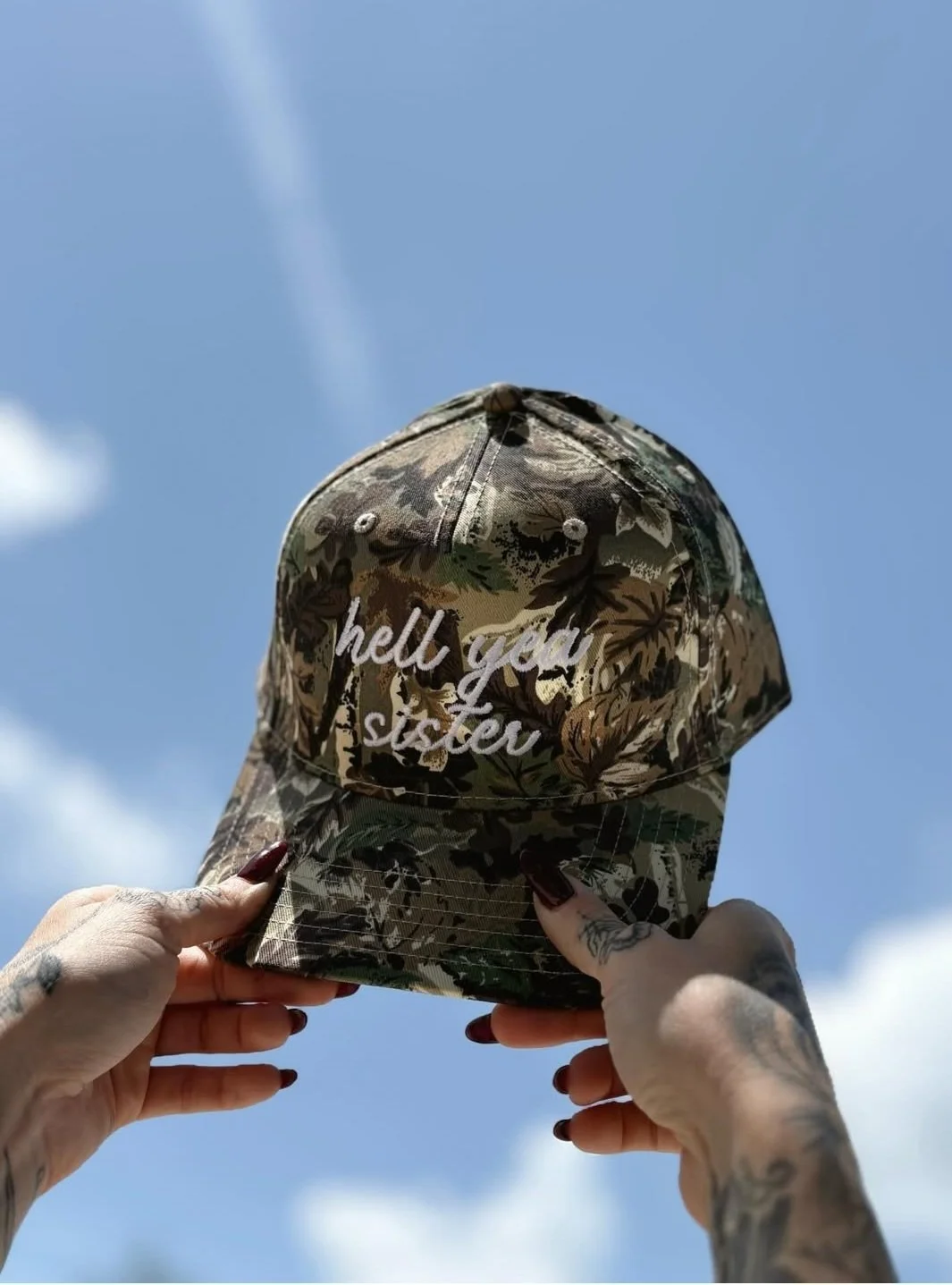 Otto Brand Trucker hat with adjustable strap. Camo print with white “hell yea sister” embroidered on the front.
